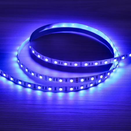12V self-adherent LED strip, 5 metres, 14.4W per metre. Colour RGB with 60 LEDs per metre, IP20, for indoor use.