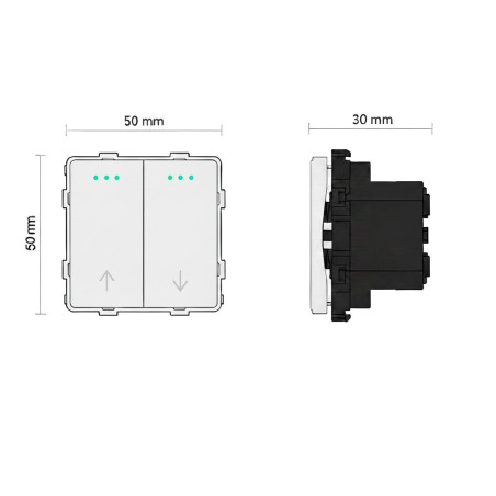 Two-key switch for shutter control, available in white or black. By pressing and holding down a button, the shutter will go up or down until the button is pressed or the limit switch is reached.