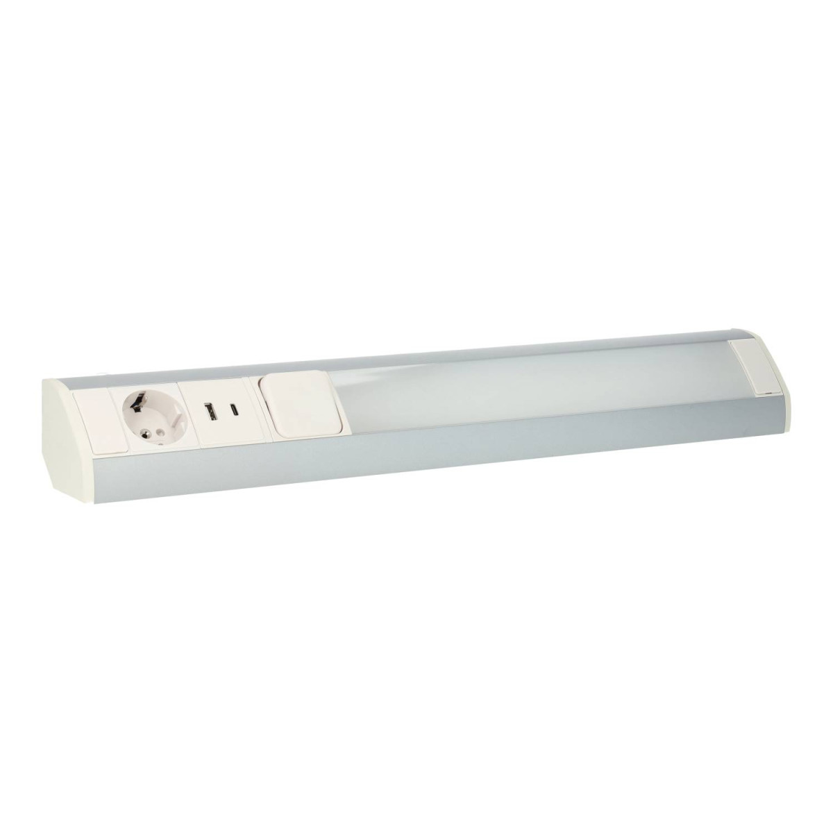 9W LED strip light with front switch, designed with a corner-shaped aluminium body and opaque PVC diffuser. It is an efficient and durable option for lighting spaces under furniture, such as worktops, desks, workbenches, etc. This linear bar has an F-type socket base (Schuko) and a double USB socket (A + C), offering great versatility in any situation.