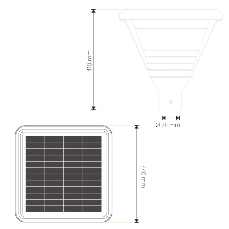 During the day, the luminaire remains off while recharging its battery. At dusk, the light turns on and turns off automatically at dawn.