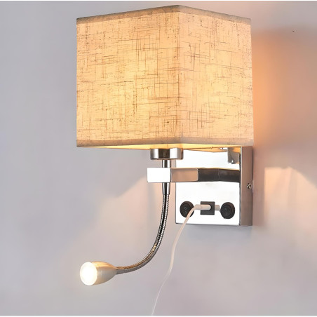 Wall light made of aluminium with a fabric shade with a base for an E27 threaded bulb. It also has a 1W flexible LED light point in warm light.