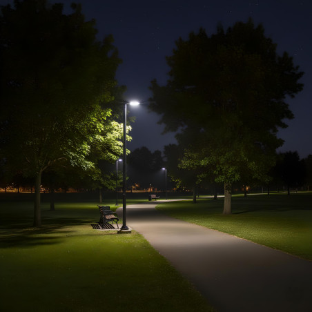 Diseñada para calles, jardines, estacionamientos, almacenes y áreas industriales. Con un flujo luminoso de 3000 lúmenes y un ángulo de apertura de 120º, esta farola ofrece una iluminación brillante, uniforme y de alta eficiencia.