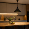 Lámpara LISBOA para interior, con casquillo de rosca estándar, E27. Esta lámpara de techo colgante con estilo nórdico está fabricada en aluminio y acabada en un exterior de color negro mate. Con su reflector color cobre aporta un punto único a cualquier estancia. En combinación con nuestras bombillas Vintage o bombillas de alto brillo E27 es ideal en el hogar para todo tipo de estancias, desde salas de estar y comedores, hasta dormitorios o cocina.
