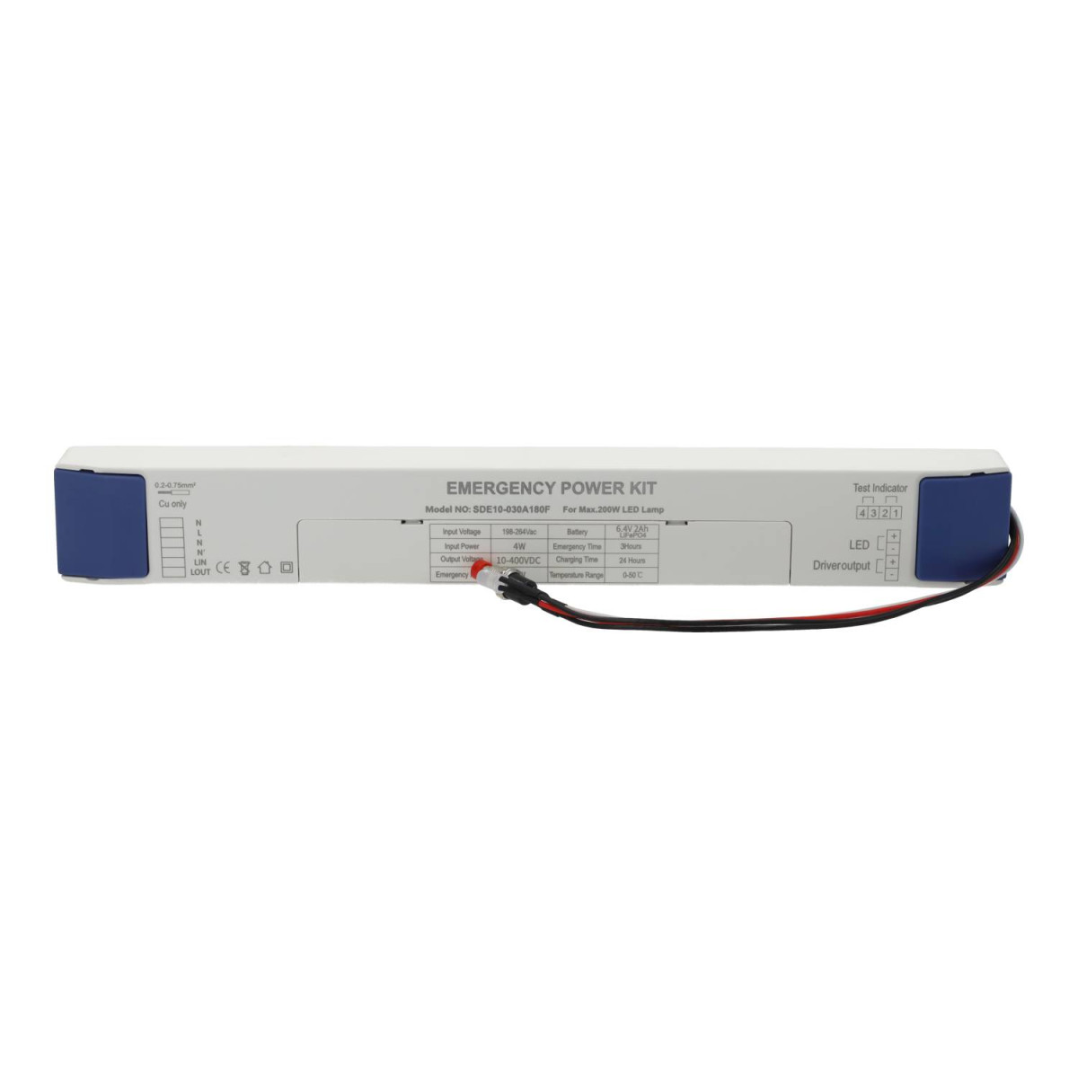 Kit di emergenza ideale per apparecchi di illuminazione a LED con potenza fino a 200 W. Consente di mantenere l'illuminazione di sicurezza fino a 180 minuti dopo un'interruzione di corrente.