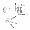 Isolatore in porcellana nei colori bianco, nero e avorio, con dimensioni di 20 x 24 mm.