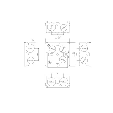 Incorpora vários orifícios pré-marcados de 20 e 25 mm de diâmetro para fixar tubo elétrico de metal.