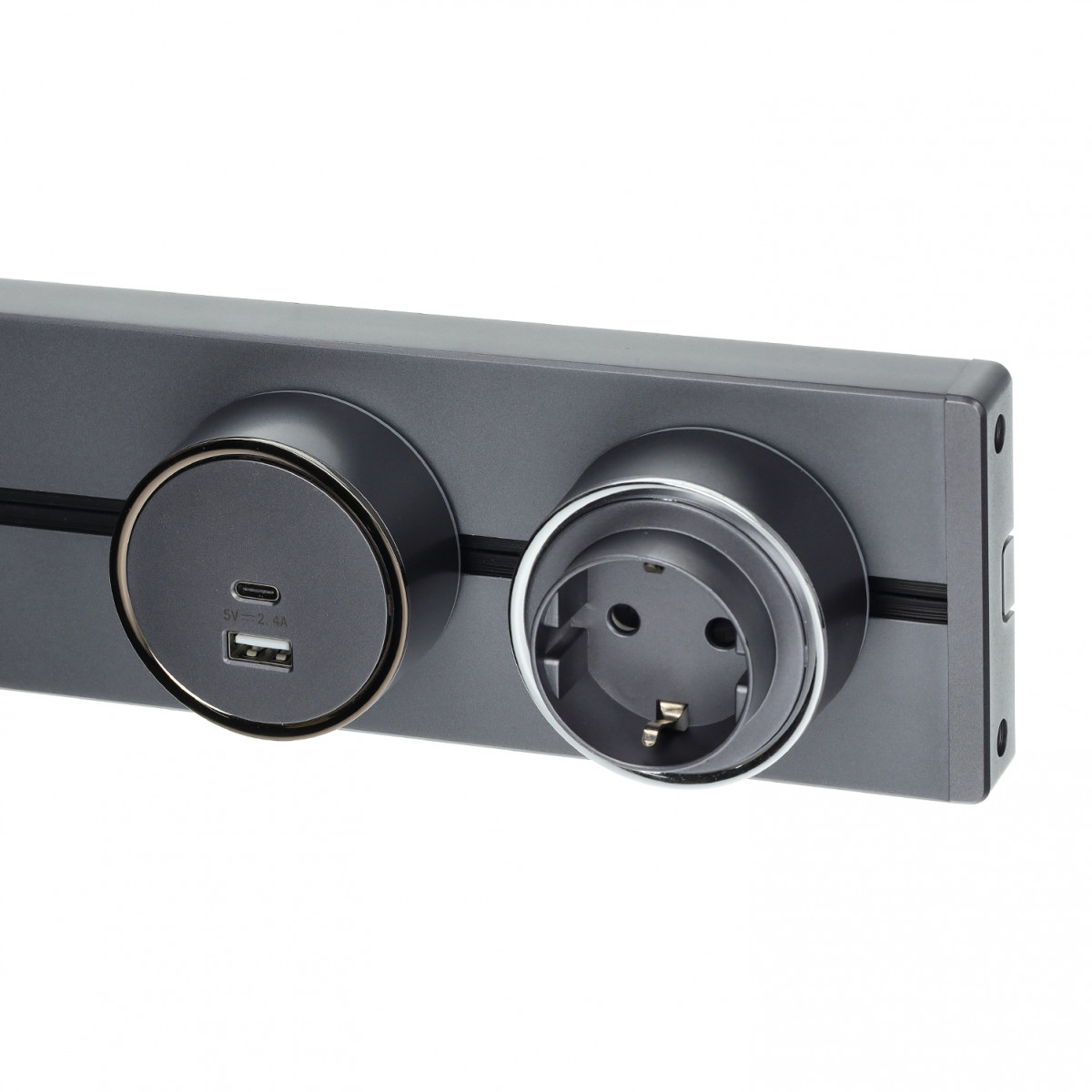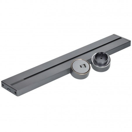 Calha para montagem à superfície, cor cinzenta metalizada. Permite o fácil acoplamento e desacoplamento de tomadas de todos os tipos, bem como a deslocação das tomadas ao longo de todo o comprimento da calha. Por isso, é ideal para locais onde é necessário variar periodicamente o número e/ou o tipo de tomadas disponíveis.