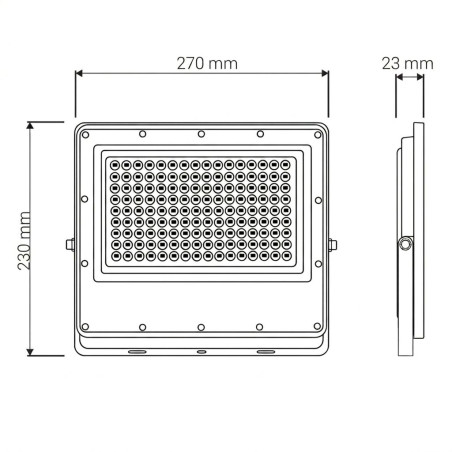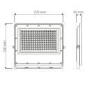 Projector LED plano de 100W para uso interior e exterior (IP66), com grande economia de energia e elevada eficiência luminosa. Disponível em luz branca fria e também em luz neutra, com 10000 lúmens.